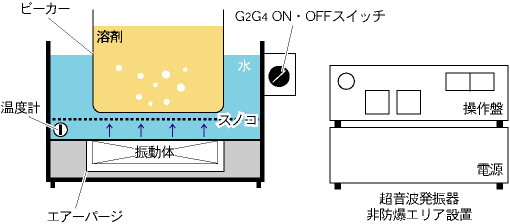 | 本装置は危険物等(アセトン他)を使用し、ビーカー内での間接処理方法超音波エネルギー(キャビテーション)効果での洗浄、反応促進に利用できます。 従来では槽内に直接溶剤等を入れることはできず、製品の品質等に関して問題が生じていましたが、それらを解決した装置に仕上げています。 |
